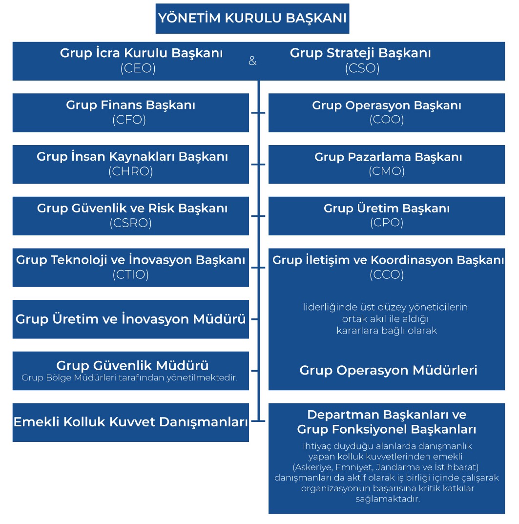 Titan Global Security Savunma Özel Güvenlik Hizmetleri Anonim Şirketi; Yönetim Kurulu Başkanı , Grup İcra Kurulu Başkanı (CEO), Grup Strateji Başkanı (CSO), Grup Finans Başkanı (CFO), Grup Pazarlama Başkanı (CMO) , Grup İnsan Kaynakları Başkanı (CHRO) , Grup Operasyon Başkanı (COO), Grup Güvenlik ve Risk Başkanı , Grup Üretim Başkanı (CPO), Grup Teknoloji ve İnovasyon Başkanı (CTIO), Grup İletişim ve Koordinasyon Başkanı (CCO) liderliğinde üst düzey yöneticilerin ortak akıl ile aldığı kararlara bağlı olarak Grup Operasyon Müdürleri, Grup Üretim ve İnovasyon Müdürü, Grup Güvenlik Müdürü, Grup Bölge Müdürleri tarafından yönetilmektedir. Departman Başkanları ve Grup Fonksiyonel Başkanları ihtiyaç duyduğu alanlarda danışmanlık yapan kolluk kuvvetlerinden emekli (Askeriye, Emniyet, Jandarma ve İstihbarat) danışmanları da aktif olarak iş birliği içinde çalışarak organizasyonun başarısına kritik katkılar sağlamaktadır.